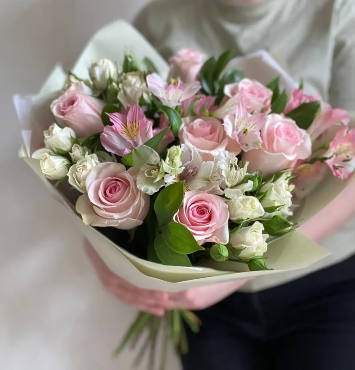 Этот букет воплощает нежность, элегантность и чувственность. Задумчиво составленные альстромерии, с их изящными контурами и пастельными оттенками, создают мягкое и романтичное настроение. Изящная паковка, украшенная деликатным атласным бантом, придает этому букету финальные штрихи приятности и нежности. Уникальность этого букета заключается в его способности подарить волшебный момент чистой радости и нежной любви.
